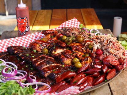 From our down home countrysides to our fall-off-the-bone hickory-smoked barbeque we pride ourselves in mastering the amazing taste of southern-style prepared meals. Comes with cherry peppers cheese bacon green onions pickles arkansauce. Big Reds Rollin Smoke Alice Springs.
